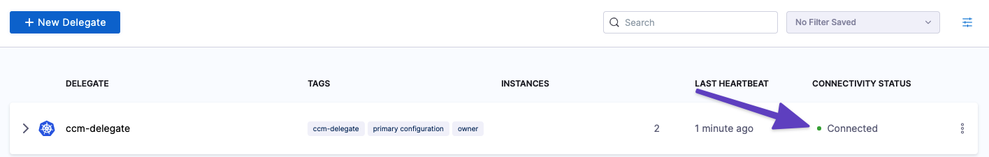 In the Harness UI, verify that the delegate appears in the delegates list. It might take two or three minutes for the Delegates list to update. Make sure the Connectivity Status is Connected. If the Connectivity Status is Not Connected, make sure the Docker host can connect to