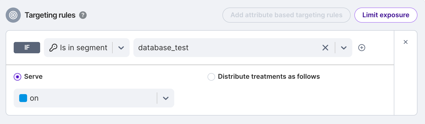 Perhaps you want to only allow a portion of your users into an experiment, maybe to reduce the risk of a new feature by exposing it to only a smaller set of your overall population. A simple way to do that is to use limit exposure. You can set the treatments to 50/50 but only send a percentage of the visitors to the rules, with everyone else going to the default treatment, as shown below. By increasing the exposure limit you add more users to the test.