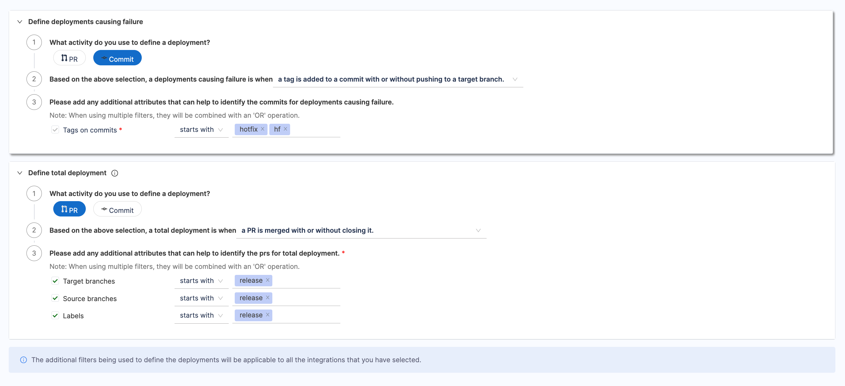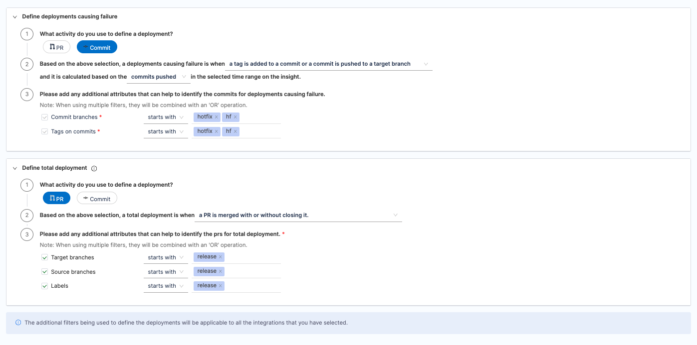 - Configure additional attributes to define deployments that result in failure or total deployments. When applying multiple filters, they will be combined using an 'AND' operation. A failed Deployment can be a hotfix or a deployment that led to failure.