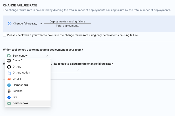 - Choose ServiceNow as the tool that you use to measure change failure rate in your team.
