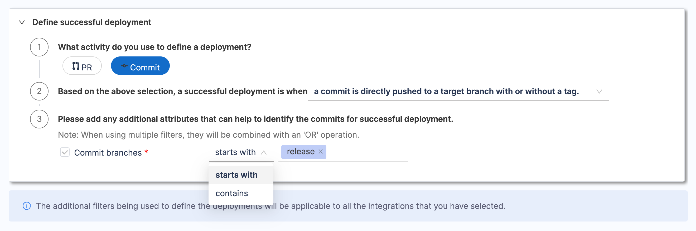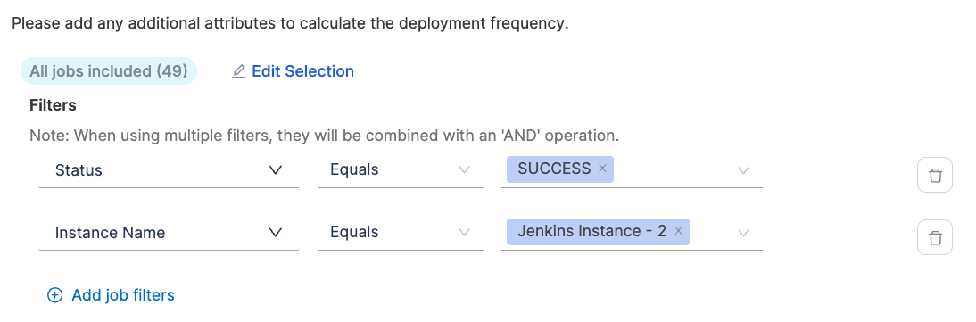 - Define additional attributes to identify deployments causing failure and total deployments. When using multiple filters, they will be combined with an 'AND' operation.
