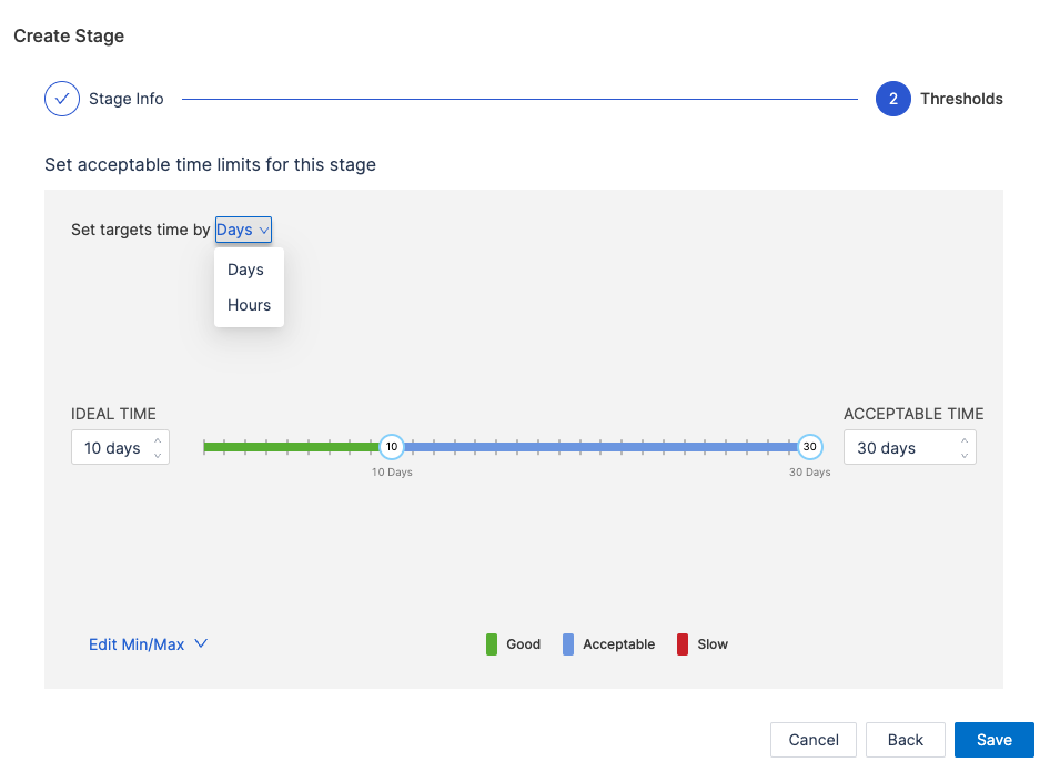 - Set acceptable time ranges for the stage, such as Ideal Time and Acceptable Time.
