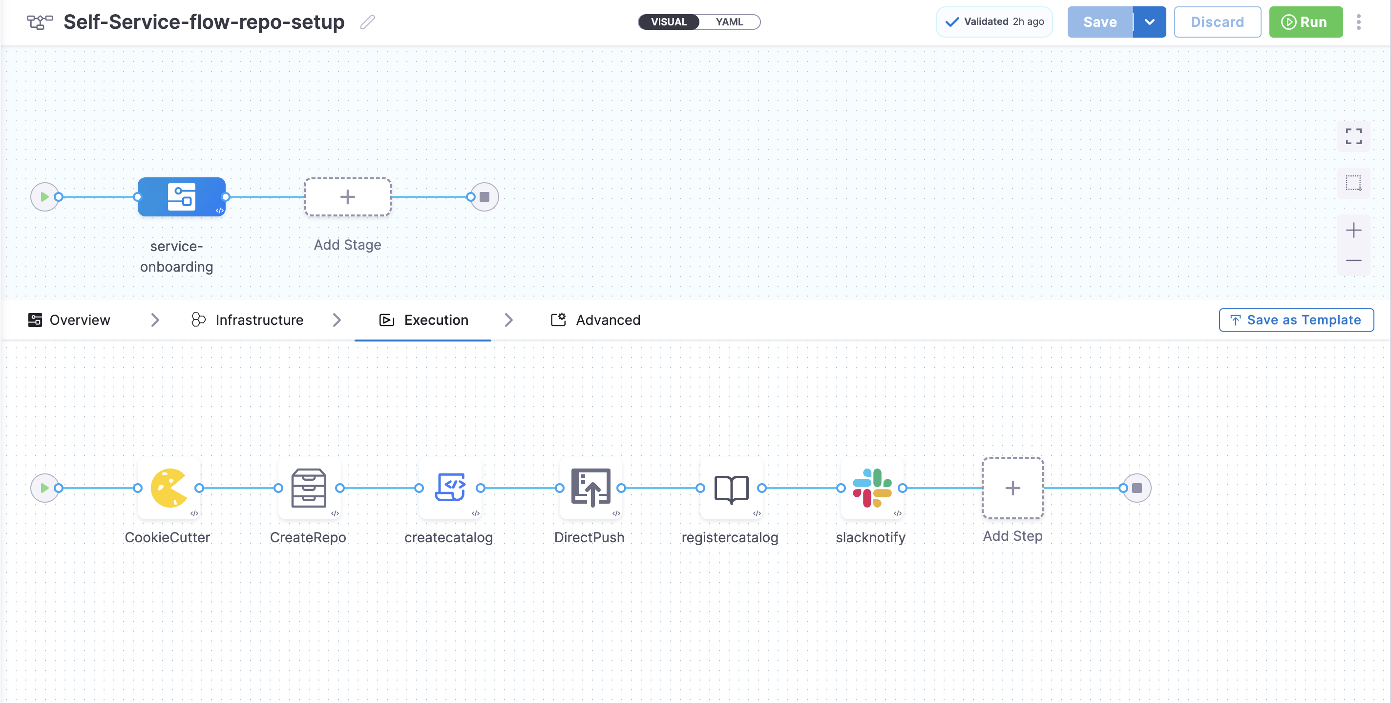• Since the trigger:harness-custom-pipeline is now synchronous, you can use the catalog:register action in a template and register the newly generated software component's catalog-info.yaml.